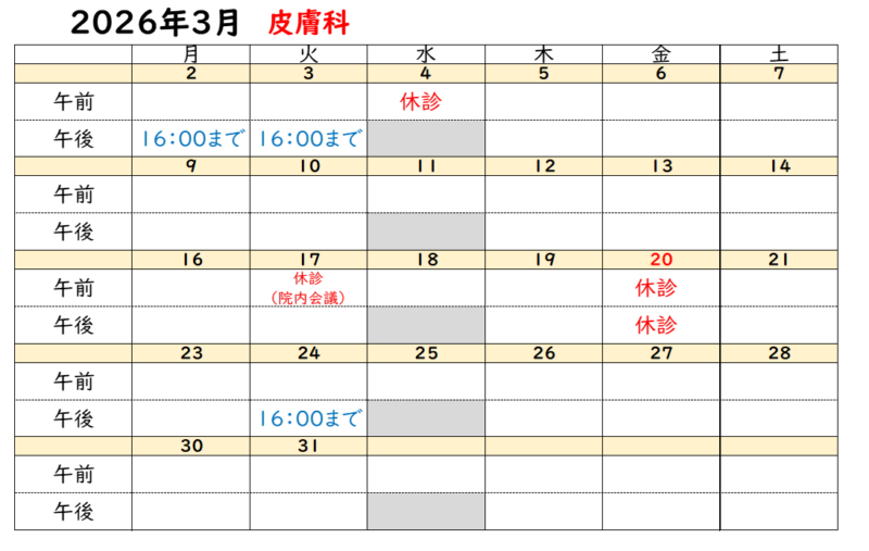 2026年3月の【皮膚科】診療のお知らせ